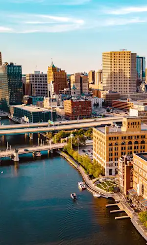 Aerial view of a modern city skyline showcasing tall skyscrapers, surrounded by residential areas with greenery, under a blue sky with clouds.