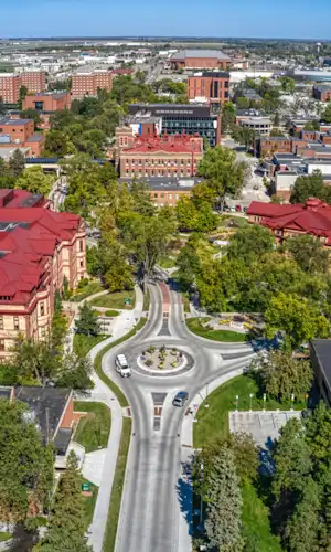 Aerial view of nebraska state capitol building in lincoln, surrounded by green landscape and urban cityscape under a cloudy sky.