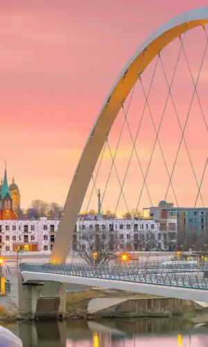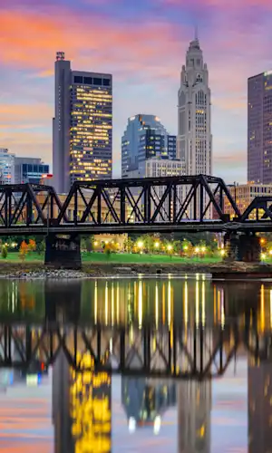 A vibrant sunset over a city skyline with modern high-rises and a historic truss bridge reflected in the calm river below.
